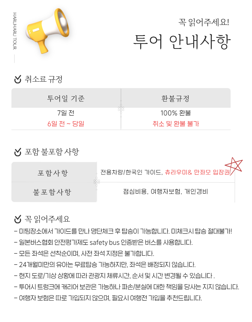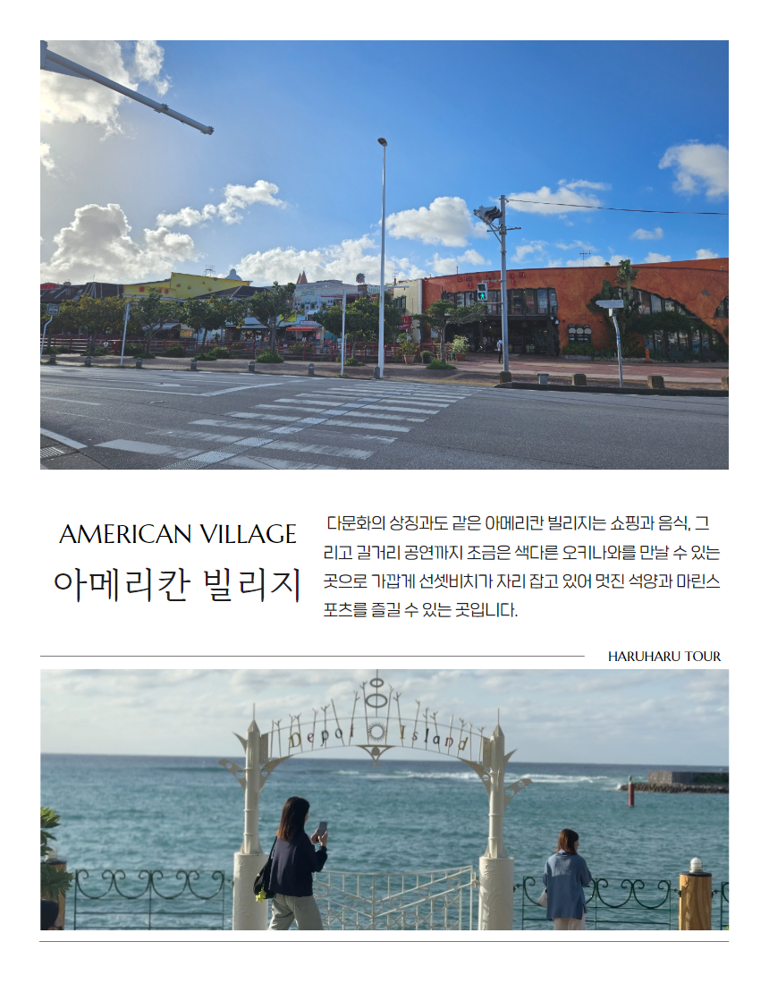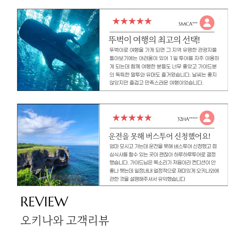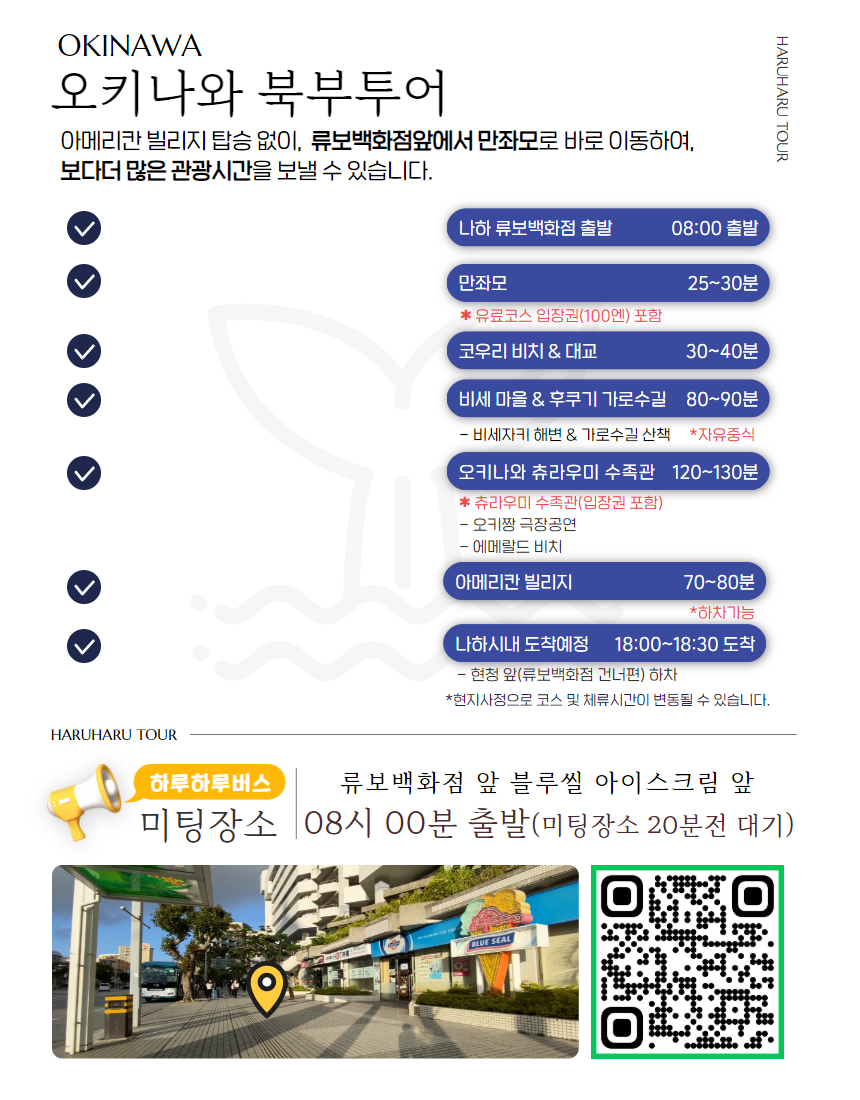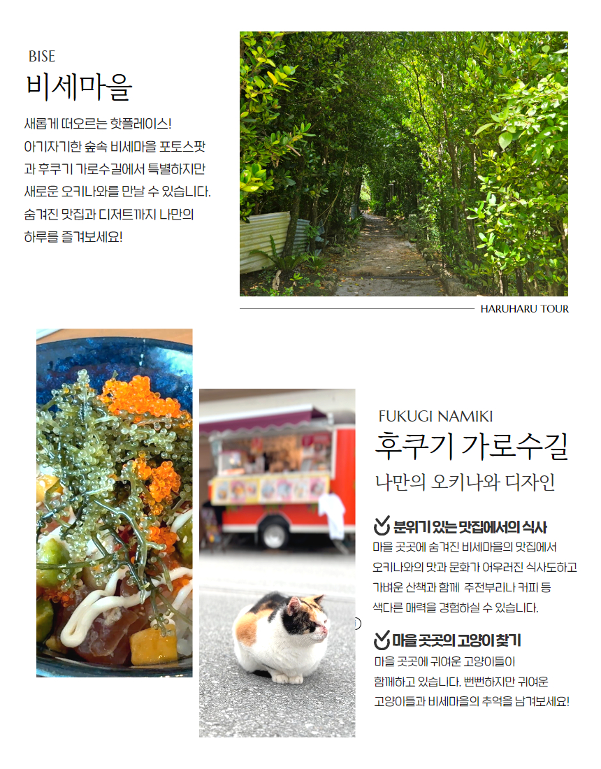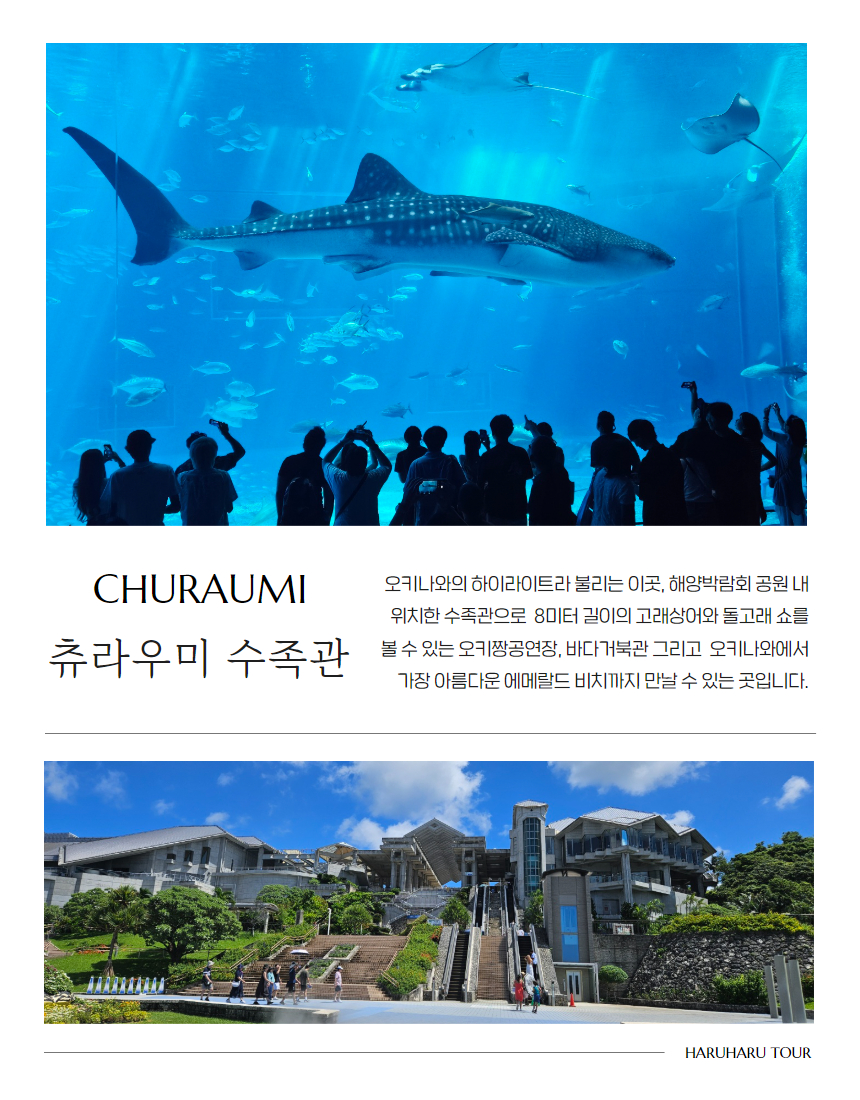 다른 여행사와 달리 중간 승차가 없어서 목적지까지 빠르게 이동이 가능했고, 다른 곳에선 들리지 않는 비세 마을 구경도 할 수 있어서 좋았어요. 추라우미 수족관에서 시간이 조금 촉박하긴 했지만 이건 어쩔 수 없는 것 같아요!