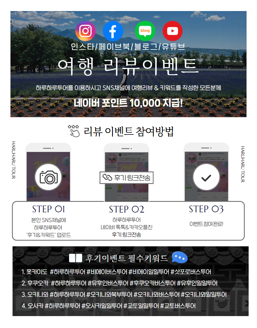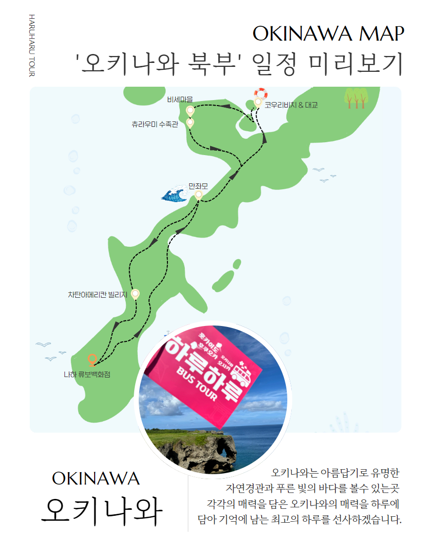 3월 오키나와 여행 때 뚜벅이라 북부까지 대중교통을 이용할 자신이 없어서 여러 사이트 비교 후 하루하루투어를 예매했고, 아침 일찍 시작해서 6시 30분에 끝나는 일정이라 피곤하지 않게 하루를 마무리 할 수 있었어요.