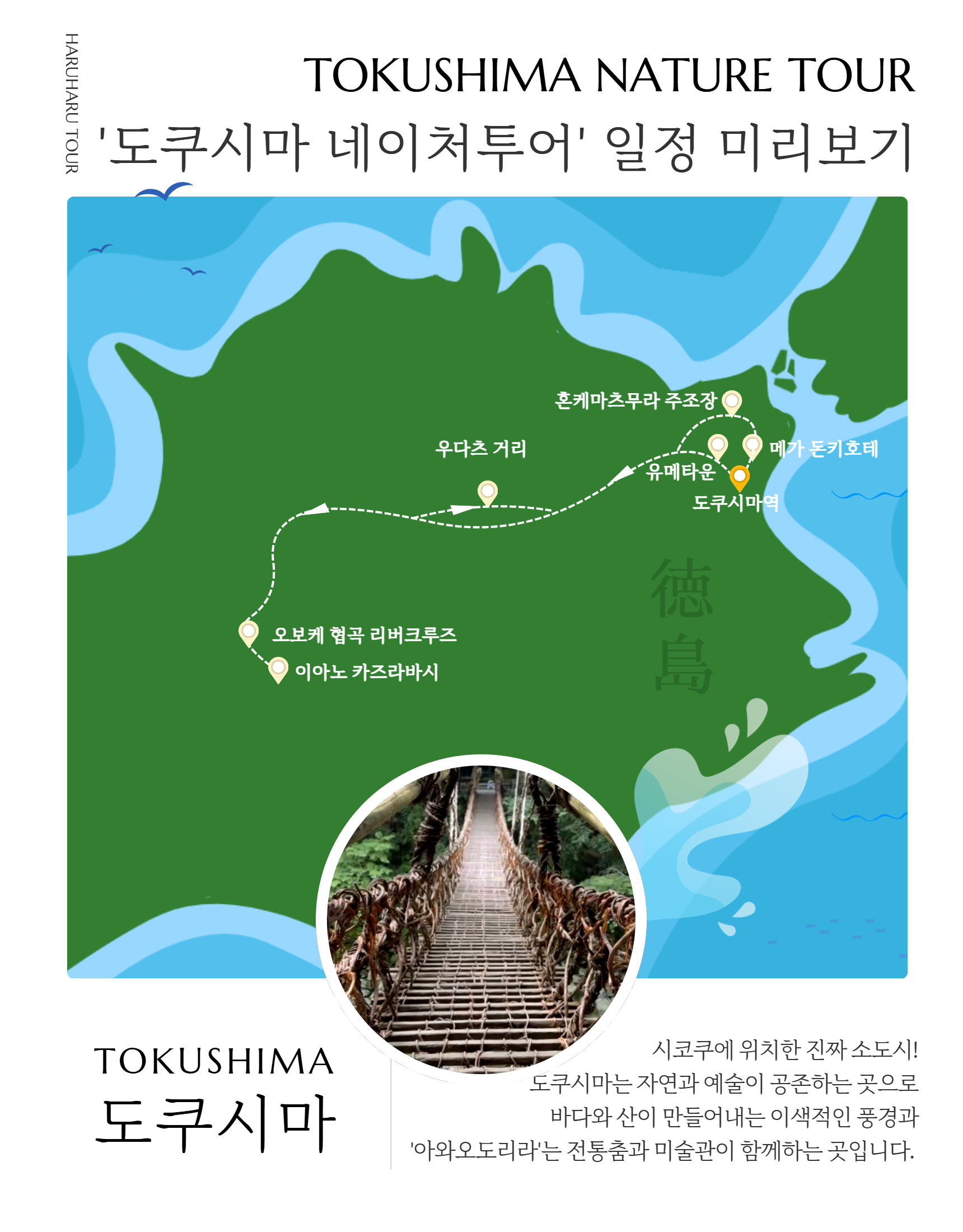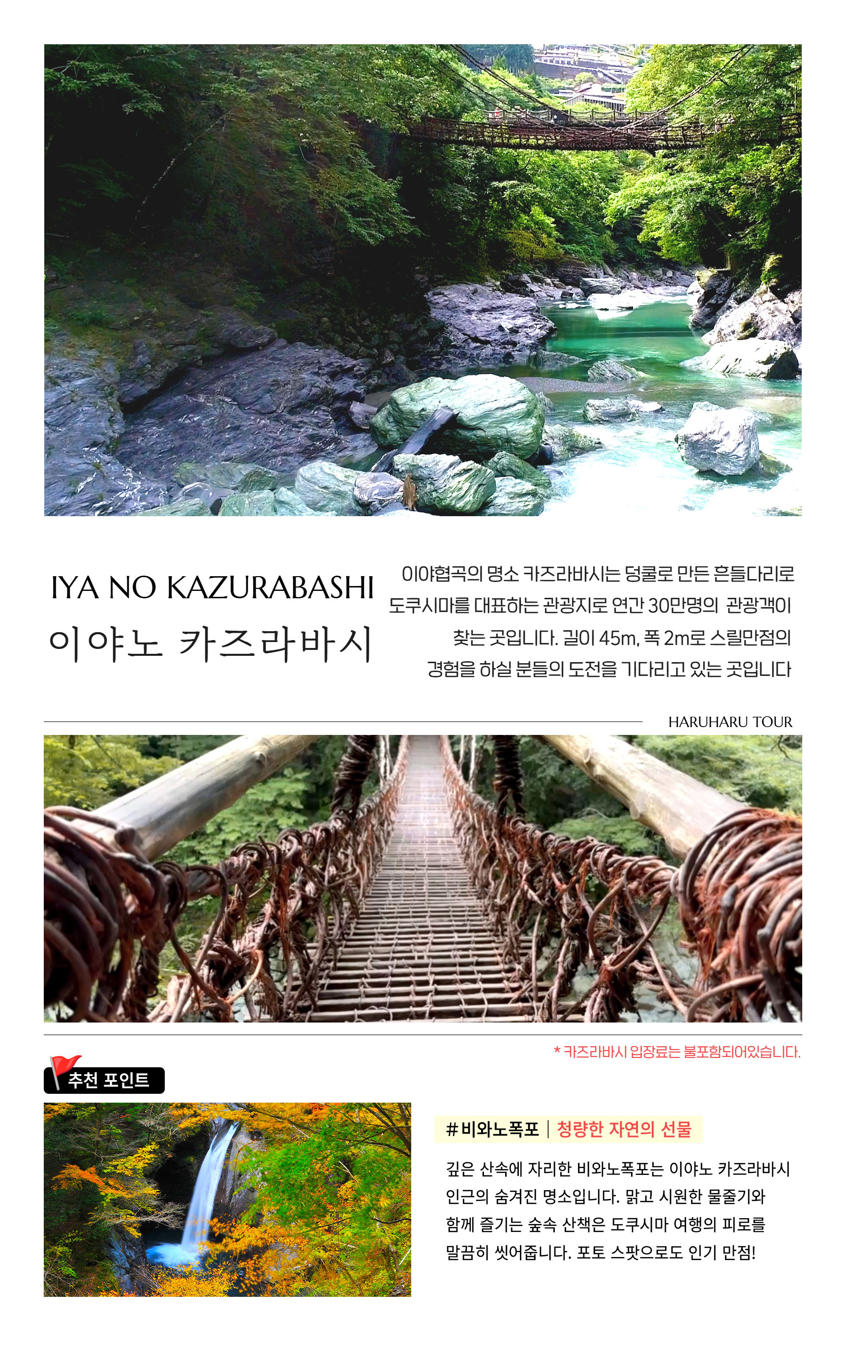 도쿠시마 일일 버스투어 시코쿠 일본 소도시 여행 오보케협곡 유람선포함 카즈라바시 우다츠 이스타항공